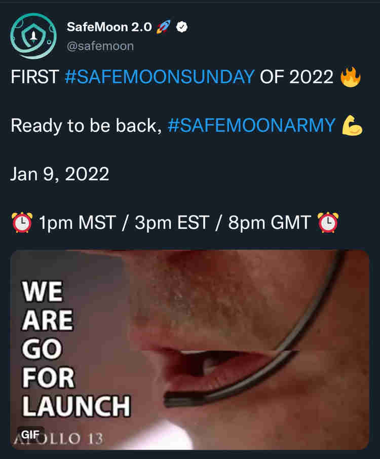 The first SafeMoon Sunday of the new year is (You guessed it!) Today! Jan 9th, 2022 at 1pm MST / 3pm EST / 8pm GMT / 1:30am IST (01/10/22)