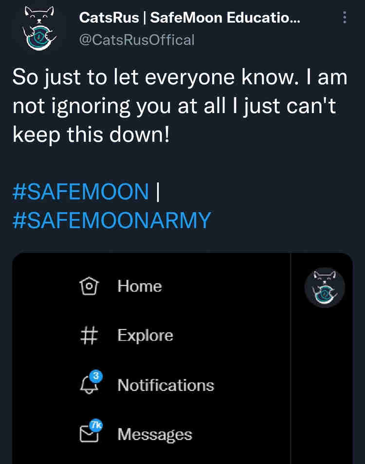 SafeMoon’s Communications and Education Manager, CatsRus, tries so hard to answer everyone’s questions! He tweeted out today, “So just to let everyone know. I am not ignoring you at all I just can’t keep this down!” Referring to a screenshot showing 7k messages he was trying to work through. Thank you for all your work, Cats!