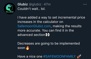 Just an hour later, Glubiz tweeted again saying “Couldn’t wait.. lol. I have added a way to set incremental price increases in the calculator on SafemoonGlubiz.com, making the results more accurate. You can find it in the advance section 👀 Decreases are going to be implemented soon 🔥Have a nice one #SAFEMOONFAMILY“