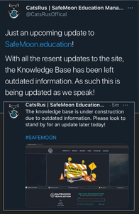 SafeMoon holders, being the detectives they are, found some information within with SafeMoon Education website’s Knowledge Base that has created a bit of a stir. However, Cats assures us that the website is outdated and so is this information. “Just an upcoming update to SafeMoon.Education! With all the [recent] updates to the site, the Knowledge Base has been left [with] outdated information. As such, whit is being updated as we speak!” He adds, “The Knowledge Base is under construction due to outdated information. Please look to stand by for an update later today!”