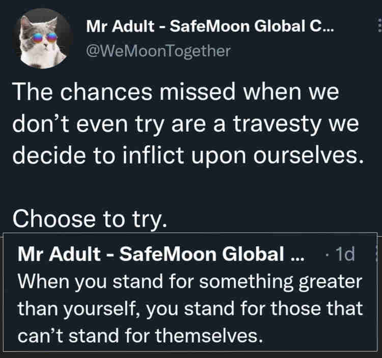 Mr. Adult, SafeMoon’s Global Community Manager, shares some inspiration with the community on Twitter.
