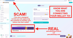 The image below shows you a Pancake Swap replica that a scammer created and how you can tell. Before connecting your wallet to any site be certain you have the correct, official URL: