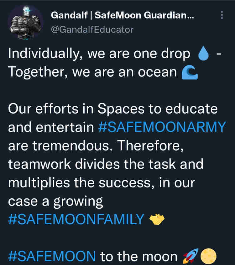 Our efforts in Spaces to educate and entertain #SAFEMOONARMY are tremendous. Therefore, teamwork divides the task and multiplies the success, in our case a growing #SAFEMOONFAMILY 🤝