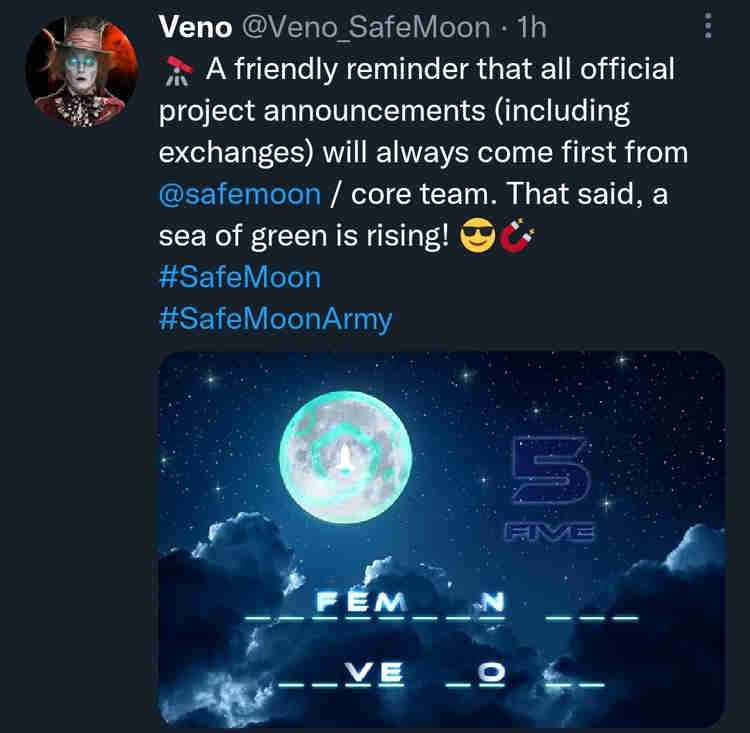“A friendly reminder that all official project announcements (including exchanges) will always come first from [SafeMoon’s Official Twitter account] / core team. That said, a sea of green is rising!”