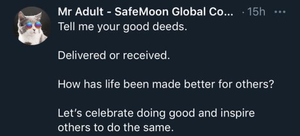 Yesterday, Global Community Manager Mr. Adult encouraged the SafeMoon Army to do good by saying, “Inspire to action. Support to create traction. Freedom of all nations. And a pizza or two. 🍕”