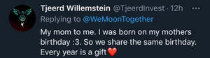 “My mom to me. I was born on my [mother’s] birthday :3. So we share the same birthday. Every year is a gift ❤️”