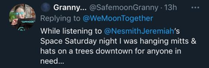 “While listening to @NesmithJeremiah’s Space Saturday night, I was hanging mitts & hats on trees downtown for anyone in need…”