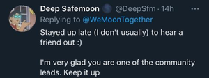 “Stayed up late (I don’t usually) to hear a friend out 🙂 I’m very glad you are one of the community leads. Keep it up.”