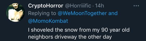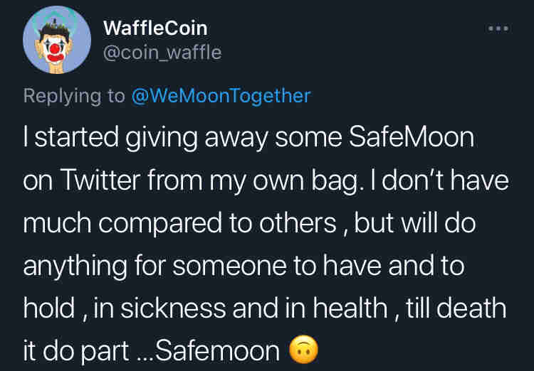 “I started giving away some SafeMoon on Twitter from my own bag. I don’t have much compared to others , but will do anything for someone to have and to hold , in sickness and in health , till death it do part …Safemoon 🙃”