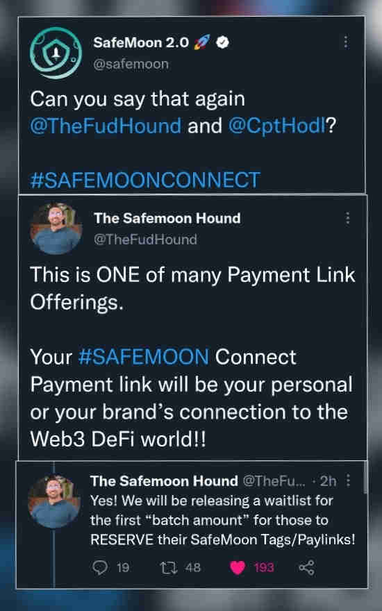 Official SafeMoon twitter account responded to the image above in a Tweet, “Can you say that again @TheFudHound and @CptHodl? #SAFEMOONCONNECT“. To which Ryan then responded. “This is One of many Payment Link Offerings. Your SafeMoon Connect Payment link will be your personal or your brand’s connection to the Web3 DeFi world!! …We will be releasing a waitlist for the first batch amount for those to RESERVE their SafeMoon Tags/Paylinks!”