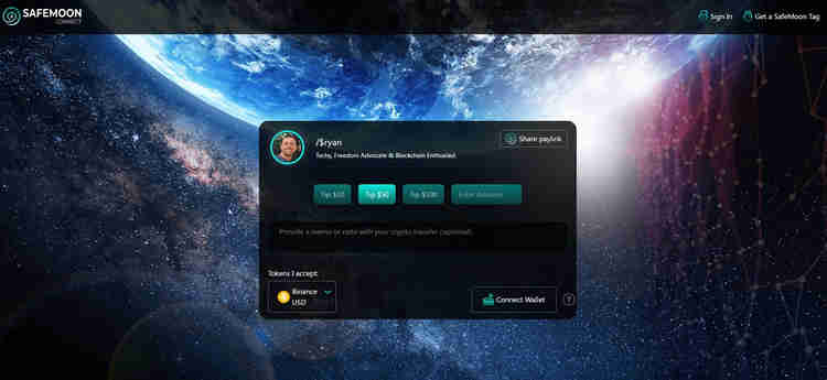 Ryan: Just to conceptualize that, think of any YouTuber out there, or any influencer or brand who maybe has a platform, or maybe their platform is YouTube, or maybe their platform is Twitter. It’s always easy to share links, just a simple URL. But what if that YouTuber can share a URL, and then when people click on it, it basically takes them to a payment link page. Through that payment link page, that YouTuber can accept tips, gifts, and payments, through crypto. That is one of our very first offerings through SafeMoon Connect which, as John mentioned, is a hub that you will be able to sign into and all the other offerings that we’re going to be offering through SafeMoon Connect will be accessed through that hub. SafeMoon Connect is just the first offering, but soon we’ll be able to get into fundraising.